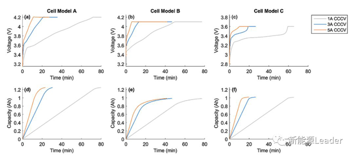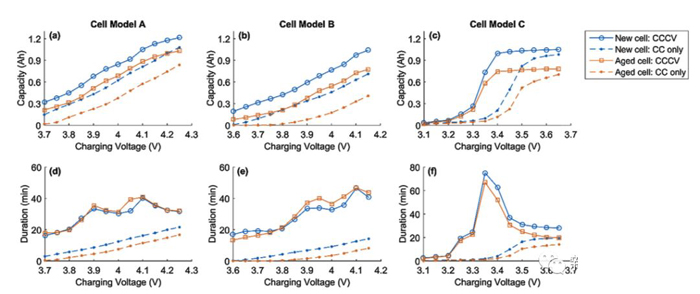 所謂的加速充電模式是在CCCV充電模式的基礎(chǔ)上增加了一個(gè)大電流的CC或者恒功率充電過程,從而達(dá)到降低充電時(shí)間的目的(如下圖e所示),有研究表明加速充電模式能夠有效的提升鋰電池的充電效率,同時(shí)又不會(huì)對(duì)鋰電池的循環(huán)壽命產(chǎn)生顯著的影響。