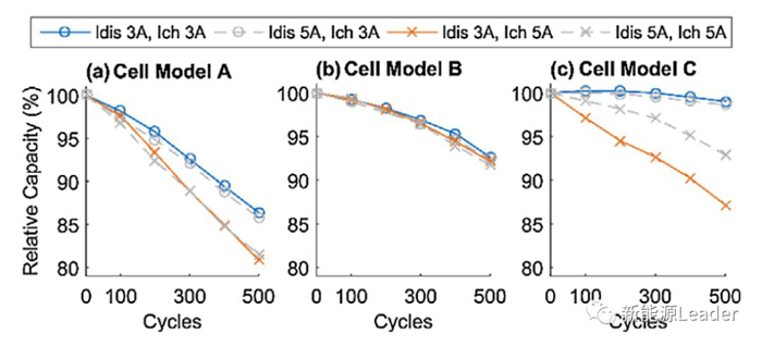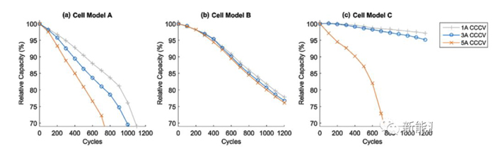 下圖為采用CCCV充電策略時(shí)不同的充電電流對(duì)于電池循環(huán)壽命的影響,從圖中能夠看到對(duì)于電池A,大充電電流會(huì)造成電池壽命的顯著下降,例如1A充電時(shí)電池的壽命可達(dá)1000次,3A充電時(shí)電池的壽命就會(huì)下降到800次,而充電電流達(dá)到5A時(shí)電池的壽命則僅為600次左右。但是對(duì)于電池B不同的充電電流對(duì)于電池的循環(huán)壽命并沒有顯著的影響。對(duì)于電池C在1A充電時(shí)電池循環(huán)1200次后容量保持率仍然可以達(dá)到97%,3A充電時(shí)電池循環(huán)1200次后容量保持率為95%,但是在5A充電時(shí)電池壽命會(huì)發(fā)生快速衰降,壽命不足700次。